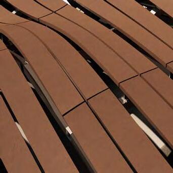 x 2’ single curved copper panel system mounted on brackets that can angle and adapt to the condition of the form. The panels overlap to hide the seams and present as a monolithic copper facade system.