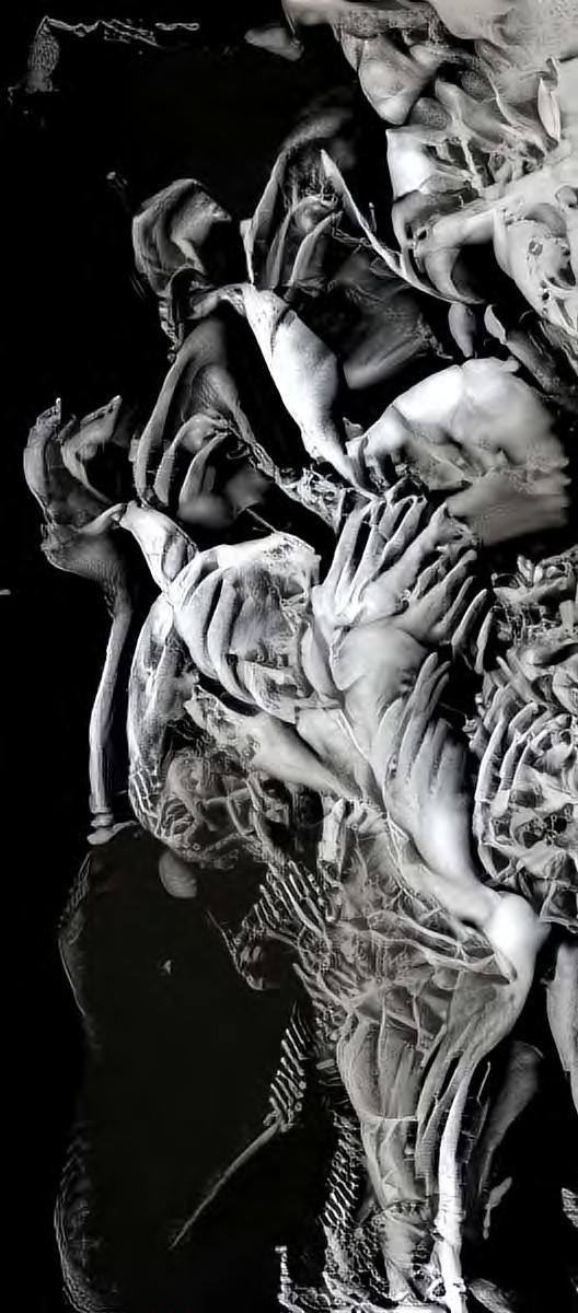 The interior organization is defined by an unraveling grotto-like space permeating from the central parliamentary space to the skin of the building. The remnants of the lattice structure that emerge on the exterior facade envelop the synthetic microecosystem of this grotto. This sanctuary represents a spatial intersection that invites nonhuman species to coexist within the research facility as indirect stakeholders within the space.