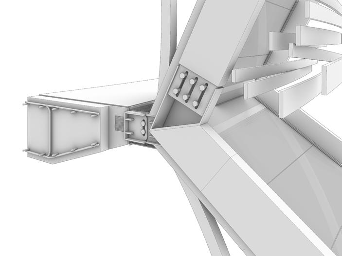 This detail shows the system in place for mounting the slumped terracotta ribs to a steel C channel via through hole bolts and gasket. That C channel is then mounted to a 4x4” steel tube picture frame that becomes the composite prefab panel brough to site. The panel is then mounted on site to a macro steel tube facade structure and that tube structure is then mounted back to the egg crate facade system.