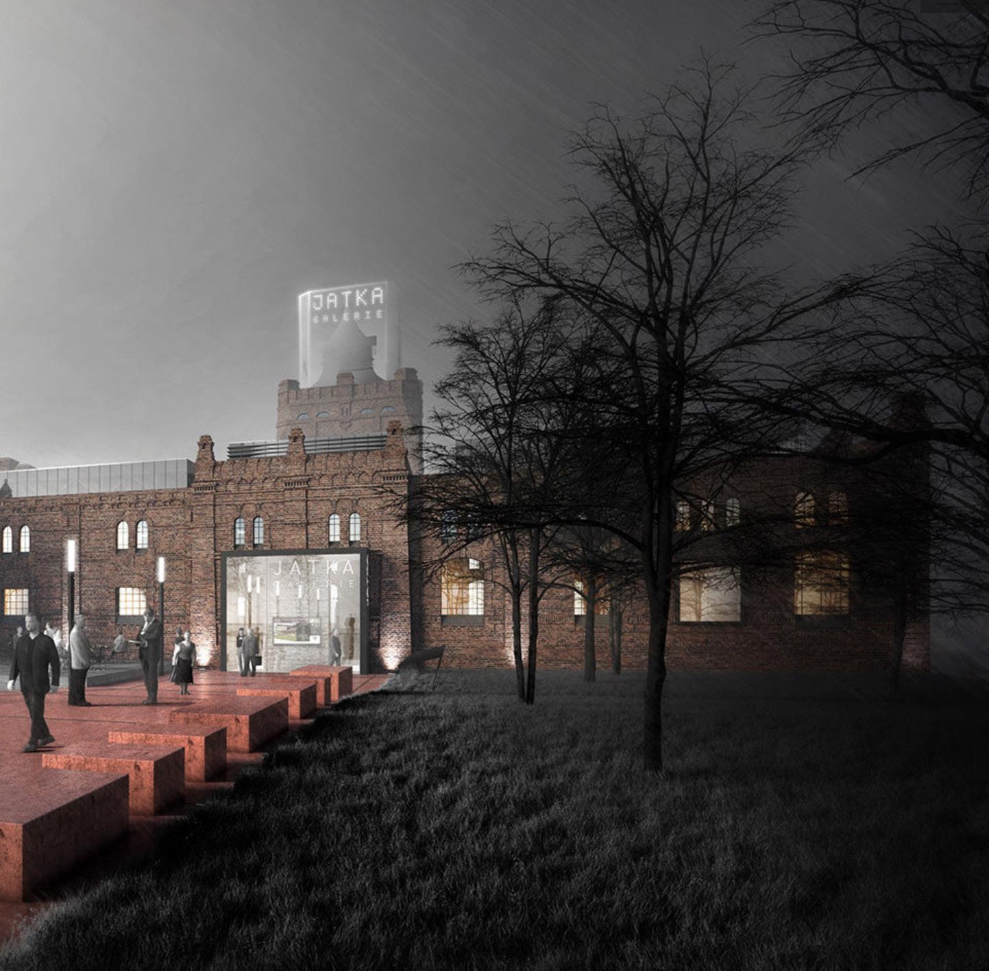 Zásadní koncepční myšlenkou návrhu je obnova vnitřního exteriérového atria a zachování existence původních budov Jatek. Z ulice Masné je navržen hlavní přístupový směr a hlavní vstup do foyeru galerie. Vedlejší vstup do stejné vstupní haly je uvažován od ulice Porážkové. Záměrem je ponechat stavbě její původní výraz a identitu, ale zároveň vytvořit nové prostory kulturní instituce 21. století. Návrh respektuje vnější vzhled Jatek z režného zdiva, který je historicky pevně spojen s místem a tvoří nenahraditelnou tvář průmyslové výstavby a kulturního dědictví Ostravy. Koncept rekonverze na galerii počítá s takovým provozním uspořádáním, které při novém funkčním využití zachovává původní objekty A, B a C, které byly v minulosti rovněž propojené v jeden provozní celek a navíc obnovením exteriérového vnitřního atria oživuje jak novou architekturu, tak odkazuje k původní srostlici budov. Návrh pouze odstraňuje objekt D jako bezvýznamnou, konstrukčně dožitou stavbua v její půdorysné stopě realizuje čtyřpodlažní novostavbu, ve které je umístěno zázemí galerie, jako jsou sklady, administrativa a ubytování. Tato servisní budova je v celém organismu budov původních Jatek uložena jako „nová dilatace“, která v budoucnu umožní propojení s novou, možná také kulturní funkcí sousedního objektu. Povrchová úprava novostavby (červené lícovky v tmavším odstínu) odkazuje k původním jatkám, ale tvarosloví je současné.