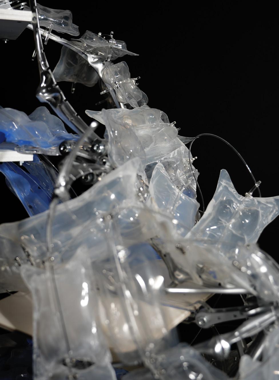 Phase-change-material enclosed in ETFE modules absorb and release solar heat as they melt and solidify. Under them, Occupants will experience transparency shifting over time, where clarity peaks as solar energy is harvested and stored, and gradually mists over as it is consumed.