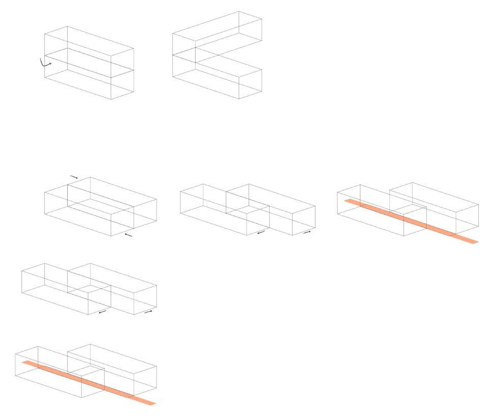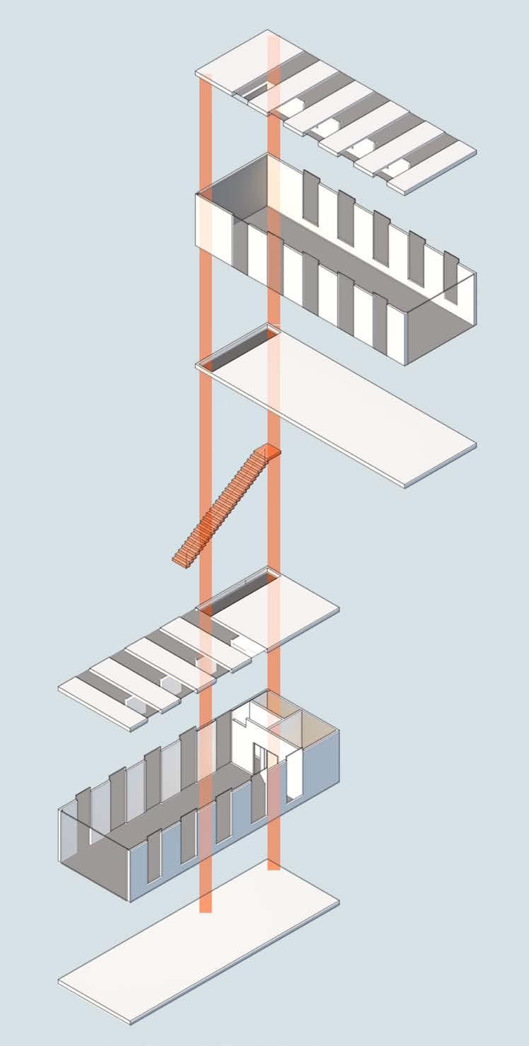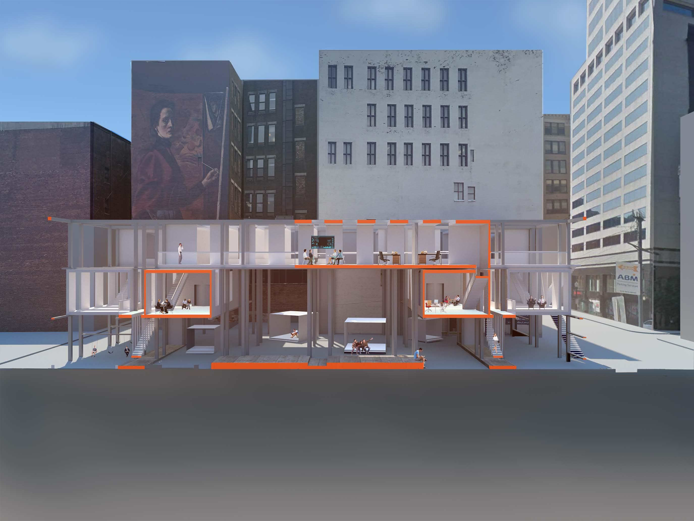 A 10’x10’x40’ prefabricated module that is insterted in a 10x10 steel grid that can be connected to each other vertically and horizontally. The floor plan can also be customized according to the user. All units elevated up a level create a public space at the ground level.