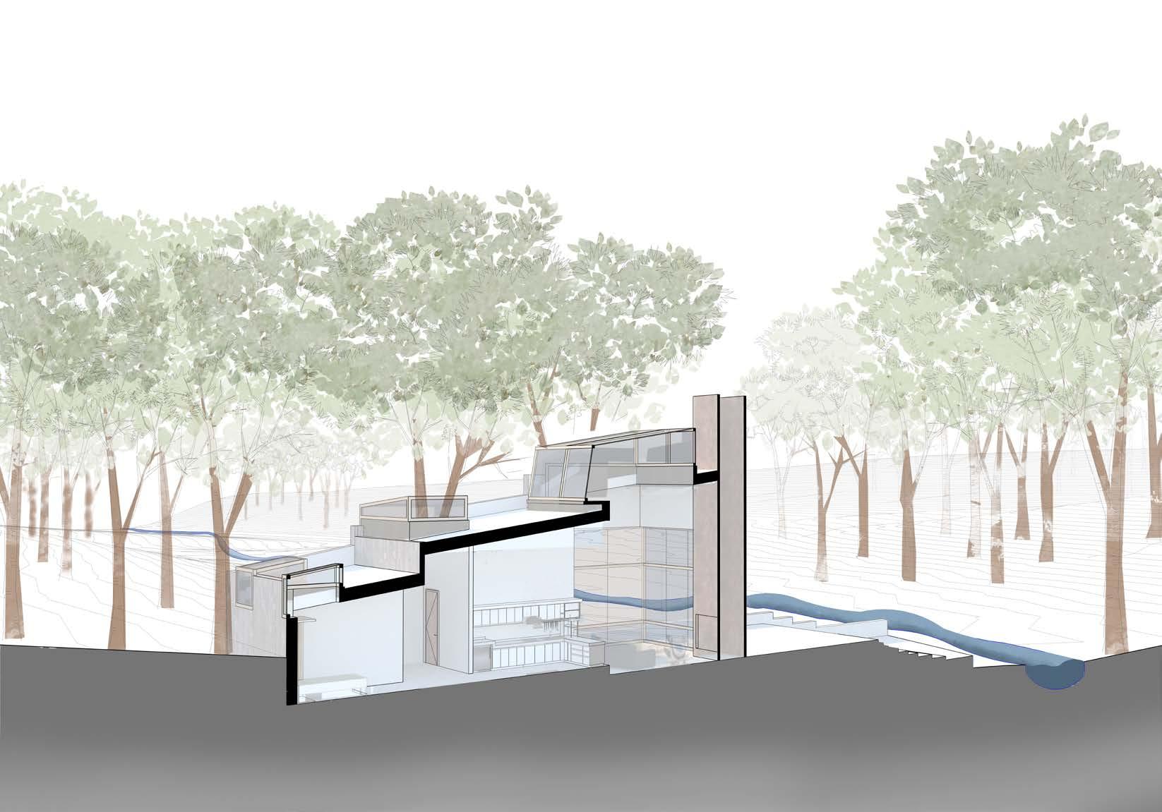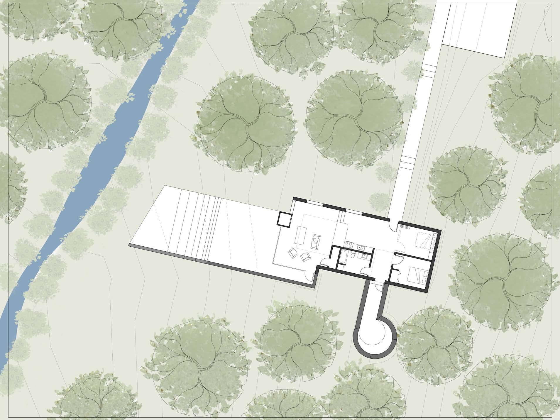 This house serves as a getaway place for a family. The idea is to disconnect from the city while being able to connect with each other and with nature. Tucked in amidst the forested area, the fenestrations and skylights bring in light while framing different views around the site. The skylights provide moments of surprise and are unique for giving the ability to look up the hill or the sky. An open floor plan creates both spaces for congregation and isolation. The linear geometry runs perpendicular to the creek and is extended out to a deck. A sunken garden is added to the side to give a secluded area for personal use. The house provides a moment to pause, relax, and reconnect.