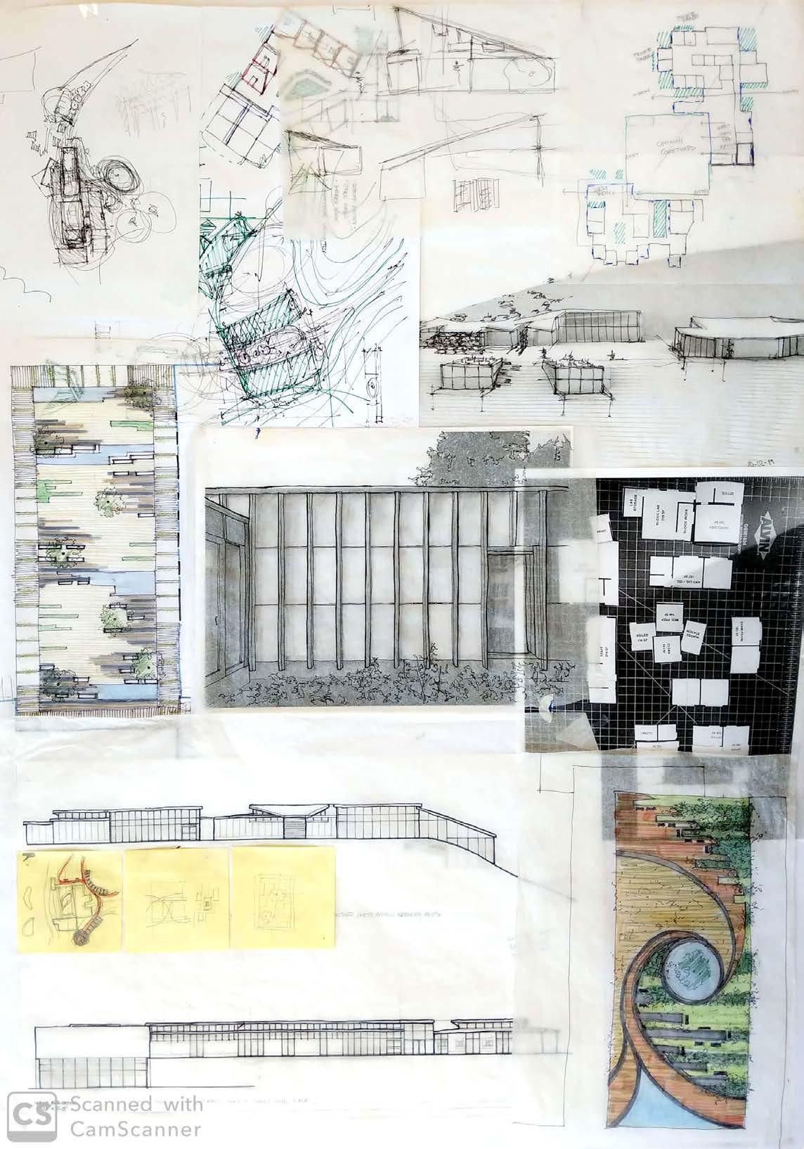 As part of a travel studio, a group of 18 students traveled to four different regions in Europe studying the design concepts and native architectural elements. After returning, we were tasked with curating and creating an exhibition. One that represented both the work we completed during the trip as well as newly built pieces. The goal was to craft a space that encapsulates the physical and emotional aspects of the travel while also exhibiting the architecture and construction that we studied. What followed was a human-scale expansive and fluid exploration of the techniques and attitutdes in architecture and construction prevelant in Switzerland. We started with an abstract collage using the photographs taken during the trip. From here we decided to tackle the design process using purely analog skills of model making and hand sketching.