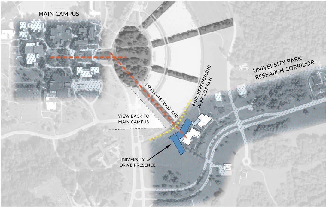 Main Campus: Horizontal grain punctuated with vertical towers.