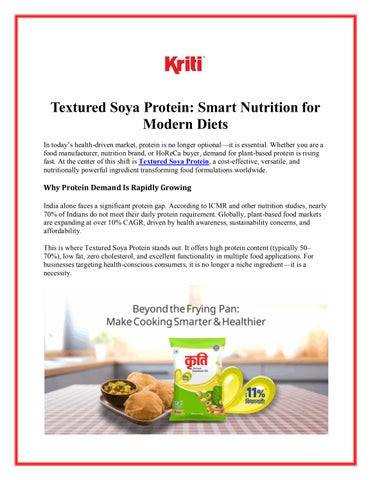 Kriti Nutrients Ltd. (founded 1992) is one of the most exciting soya product manufacturing companies in India. The company is engaged in soya bean processing; from this activity, it produces branded refined soya bean oil and value-added protein-based products. These products address specialised applications in the food, aqua & poultry, dairy and pharmaceutical sectors. The company manufactures soya protein and soya lecithin for downstream industrial users and manufactures, markets, packages and brands edible refined oil for its retail consumers.
