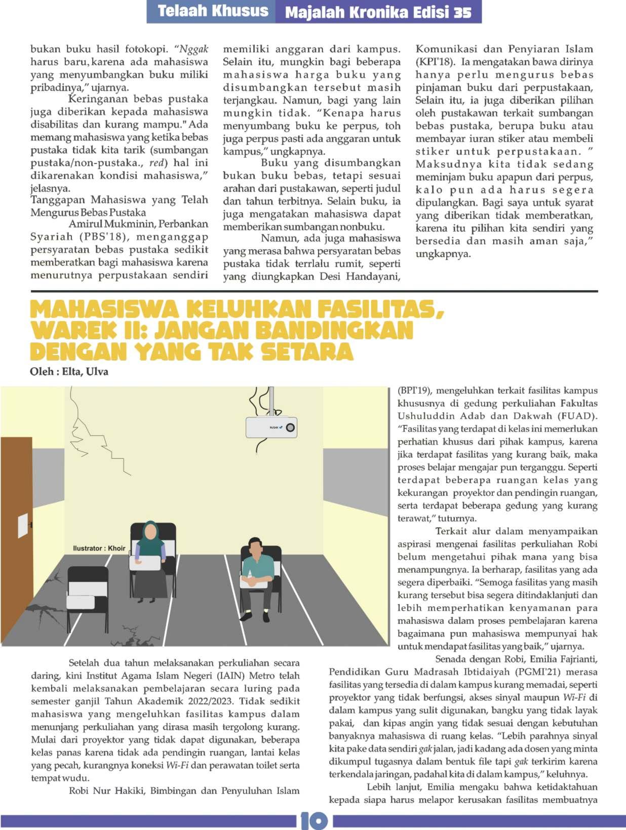 Bergeser ke telaah khusus, kita akan melihat bagimana persoalan bebas pustaka yang menjadikan mahasiswa memiliki dua pilihan, menyumbang dalam bentuk pustaka atau nonpustaka. Selain itu, terdapat rubrik kabar kampus yang salah satunya membahas mengenai kesekretariatan Dewan Eksekutif Mahasiswa Institut (Dema-I) yang seringkali sepi dari pengurusnya bahkan seringkali digunakan oleh Organisasi Mahasiswa (Ormawa) lain.