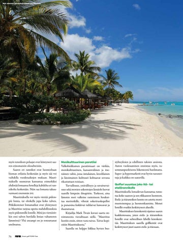 myös tenniksen pelaajat ovat kiintyneet saaMonikulttuurinen paratiisi ren erinomaisiin olosuhteisiin. Valkohiekkainen paratiisisaari on värikäs, Saaren eri rannikot ovat luonteeltaan monikulttuurinen, kansainvälinen ja itsehieman erilaisia keskenään ja myös sää voi näinen valtio, jossa intialainen, kreolilainen vaihdella vuodenaikojen mukaan. Maurija länsimainen kulttuuri kohtaavat sovussa tiukselle suuntavan kannattaa esimerkiksi rikastuttaen toisiaan. yhdistää lomaansa hotelleja kahdelta eri ranTurvallisuus, ystävällisyys ja suvaitsevainikolta keskenään. Näin saa lomasta takuusuus sekä monien uskontojen läsnäolo luovat varmasti enemmän irti. saarelle lempeän ilmapiirin. Turkoosi, aina Mauritiuksella voi myös viettää pidemlämmin meri valkeine rantoineen houkutpiä lomia, tai oleskella jopa koko talven. taa meriretkille, vihreät sokeriruokopellot Pitkäkestoiset ovat yleistyneet ”Australianlomamatkat Adam Scott vähätteli ja punaisina kukkivat tulilatvat lumoavat ja ja Mauritius tarjoaa upeita mahdollisuuksia ihastuttavat. olympialaisten merkitystä ja myös pidemmille lomille. Mitä jos viettäisitKirjailija Mark Twain kuvasi saarta onkorosti, että golfammattilaisille kin ensi talven huvilalla Intian valtameren nistuneesta vierailtuaan siellä. ”Mauritius majorit ovat olympialaisia lämmössä? Yhä useampi on jo toteuttanut luotiin ensin, sitten vasta taivas. Taivas kopitärkeämpiä.” unelmansa. oitiin Mauritiuksesta.” Saarella on helppo liikkua hyvien bus76