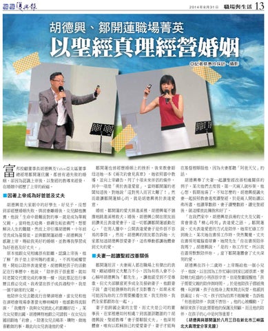 邦投顧董事長胡德興及Yahoo亞太區董事 總經理鄒開蓮伉儷,都曾有過失敗的婚 姻,卻因為認識上帝後,以聖經的教導來經營, 在婚姻中經歷了上帝的祝福。