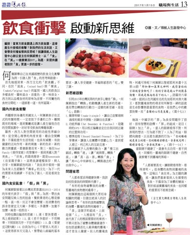 物,何處可得呢?何佩穎以聖經耶利米書十五 章16節「耶和華─萬軍之神啊,我得著祢的 言語就當食物吃了;祢的言語是我心中的歡喜 快樂,因我是稱為祢名下的人。」詩篇卅六章 7-8節,提到以色列國有名的先知耶利米與大衛 王,都對靈魂食物的尋求有所解答,神的話就 是生命影響與最重要的食物,是我們心中的歡 喜快樂,而「喜樂的心乃是良藥」(箴十七2) 。 她說,中國字的「罪」為食安問題作了很 好、很有智慧的詮釋。「罪」的組成,是目( 眼睛)加上「非」,當人的眼睛看得不對,所 表現的想法、行為就不對了。人為了利益,眼 睛向錢看,以至產生錯誤的行為。「你的眼睛 就是身上的燈。你的眼睛若瞭亮,全身就光明; 眼睛若昏花,全身就黑暗。」(路十一34)。 當眼睛不健康了,就會失去功用,看不到 光,同樣的,靈魂的眼睛不健康,自然 就察覺不到靈魂的黑暗。 「人都需要真光,讓眼睛看得對、看 得清明。」從身體的食物到靈魂的食 物,這場以「食在美」為主題的講 座,讓我們重新看到人生需要的 美食,不僅是為了身體的層面, 對於能滋養靈魂的美食,也同樣 的重要而不能被忽視。 (全文蒙允轉載自領航人生啟 發中心)