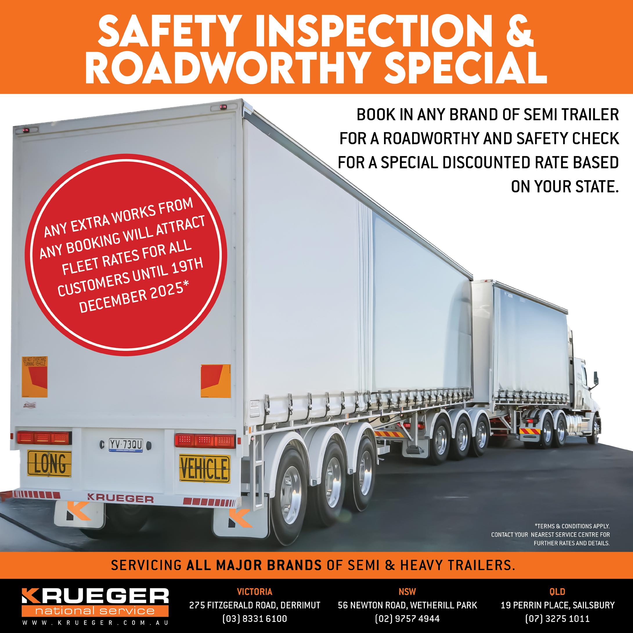 With safety standards tightening and fleets under increasing scrutiny, Krueger’s fully accredited roadworthy and inspection services give operators the assurance they need to stay compliant, stay safe and stay on the road.