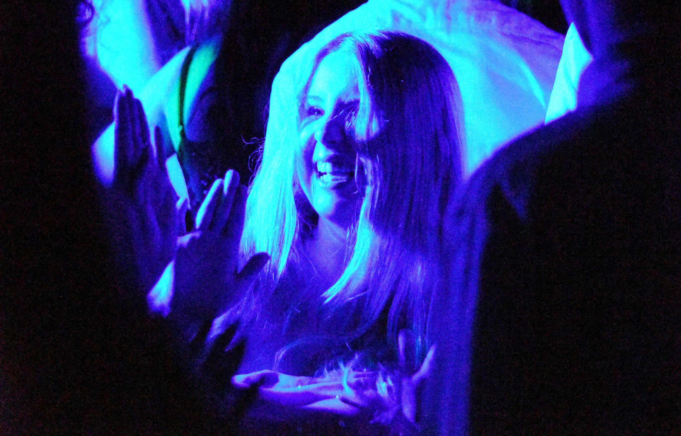 TStudents gather on the dance floor as bright lights and music fill the gym.