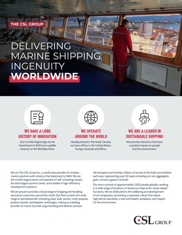 We are The CSL Group Inc., a world class provider of complex marine solutions with a history that dates back to 1845. We are the world’s largest owner and operator of self-unloading vessels, the third largest cement carrier, and a leader in high-efficiency transhipment solutions.