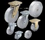 Kraftige industrihjul med fuldelastisk massivgummibane i oppresset stålpladegaffel. Fås også med grå afsmitningsfri bane type-SG