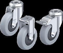 Apparathjul med bolthulmontering. Hjul med ’’Blickle SoftMotion’’ blød massivgummibane, med polyamidfælg, afsmitningsfri, grå, med kunststof-trådbeskytter.
