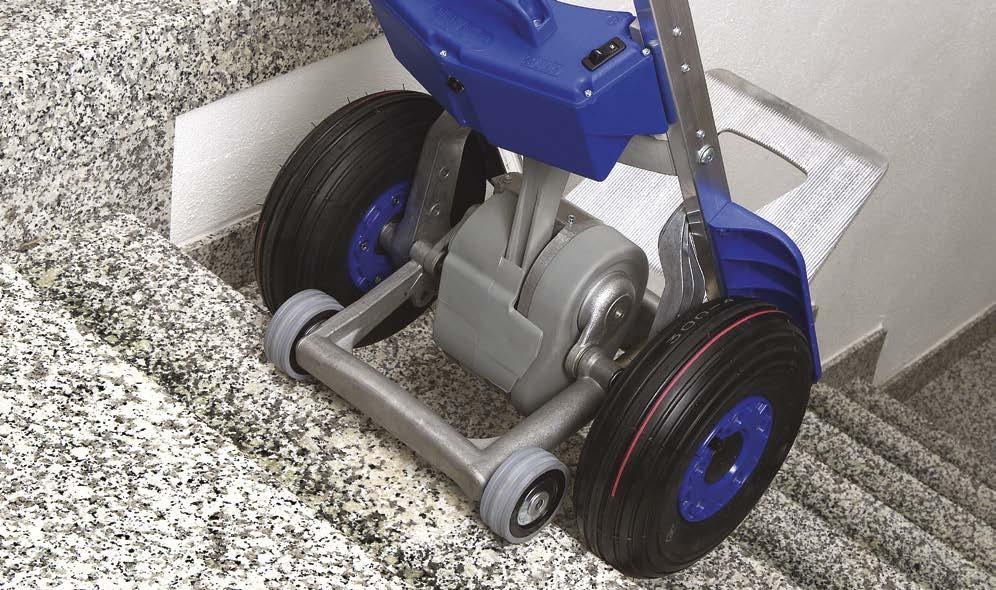 Støttehjul systemet kan aktiveres hurtigt ved at klappe det ud ved kørsel på fladt terræn og klappes op når man holder ved trappen.