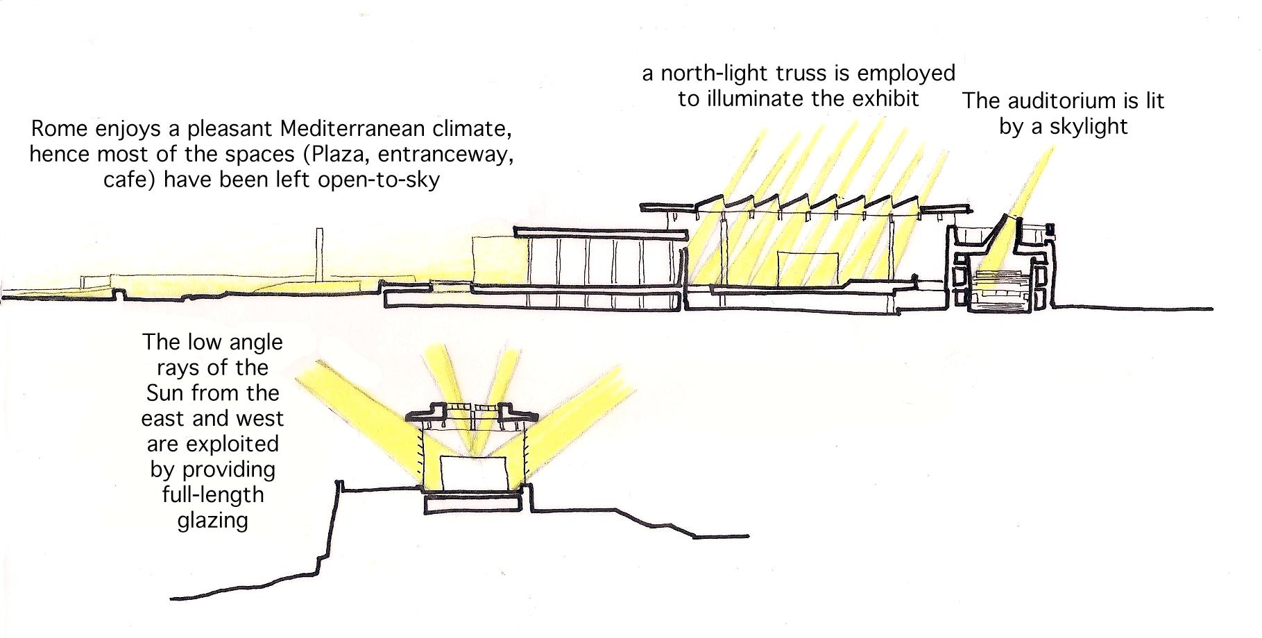 The roof over the main hall rests on four columns with skylights to maximize the natural lighting and eliminate “false shadows”. Outside the main structure a low travertine wall extending from within the main hall traces the shore of the river Tiber. An outdoor roof terrace above the auditorium functions as a bar and café with views of the Mausoleum of Augustus to the east and river Tiber to the west