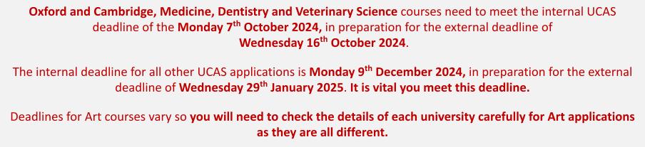 The internal RVHS deadline will be Monday 9th December 2024. By this date all processes, including your personal statement and UCAS application form must be completed