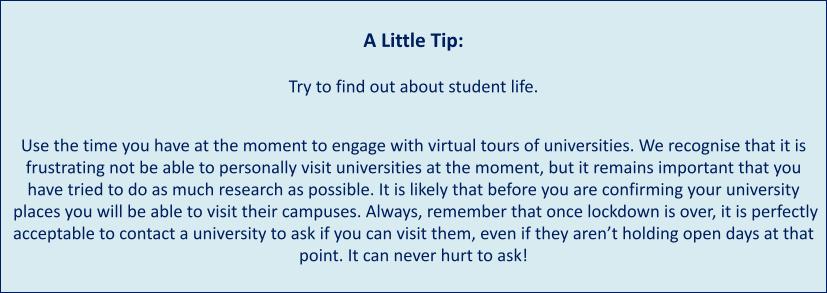 Make sure you choose Open Days at weekends or in the holidays as it is vital that you do not jeopardise your chances of success at A Level by missing lessons.