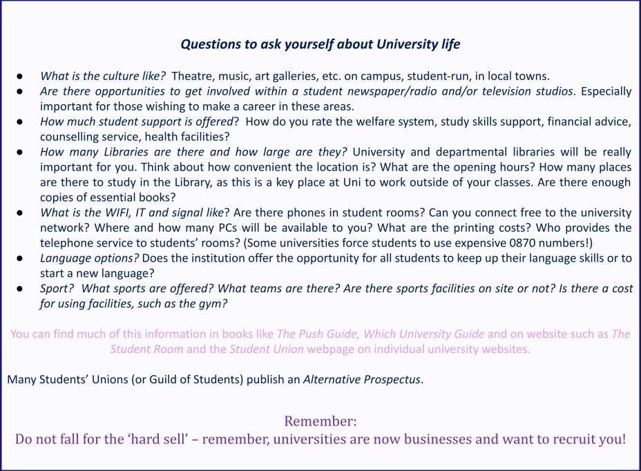 Remember you are choosing a place as well as a course, but do not let considerations of the place override the choice of the course which best suits you Try to visit the institutions you are seriously considering at some point this academic year – first impressions are important