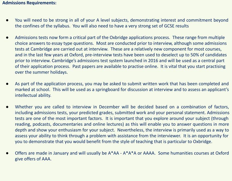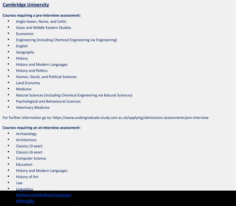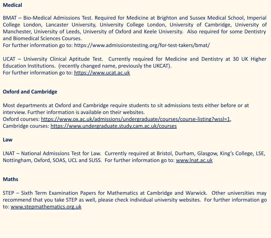 ● For an increasing number of courses, including some Medicine, Dentistry, Veterinary Science, Law, History, Physics, English and Oxbridge courses candidates also need to register for subject specific tests