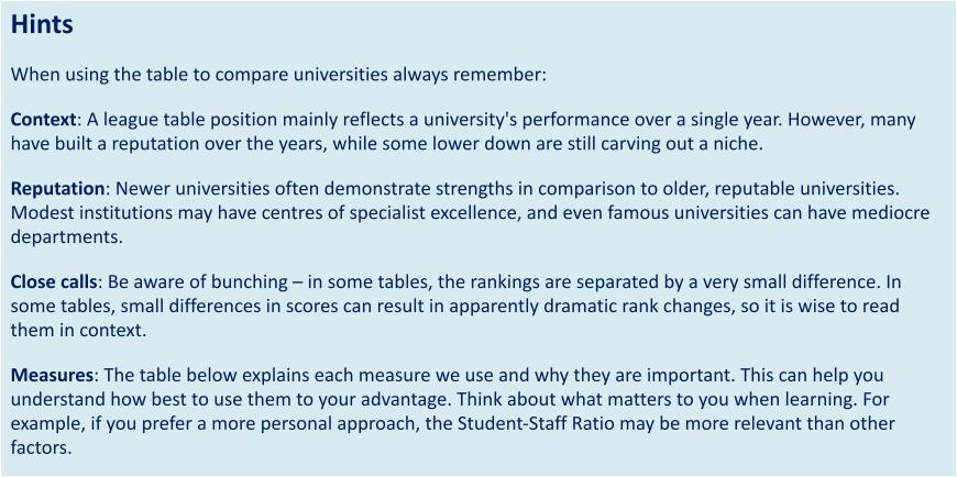 League tables are published which rank universities overall, and also by subject You will need to examine these carefully and ask lots of questions about how they are compiled Points are earned for research, teaching quality, facilities and graduate employment. Make sure that you read the section of this booklet about league tables for hint and tips.