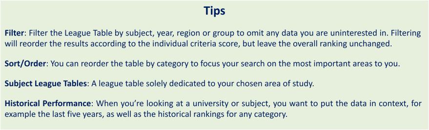 We recommended The Complete University Guide website for comprehensive and easy to use league tables. www.thecompleteuniversityguide.co.uk/league-tables
