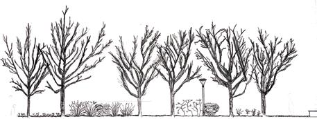 In an exercise to explore planting design and its evolution over time I deconstructed the existing site of citygarden. Analyzing the ground plan, shrubs/structural layer, and trees, I manually measured and sketched plantings in both plan and section, later adding digital annotations. This study aimed to document the variance between design intentions and the actual outcomes in terms of plant morphology, spacing, and their interaction with other constructed elements and human activities. It also considered the effects of time on plant growth, losses, maintenance practices like pruning, and spatial factors such as increased shade or plant crowding.
