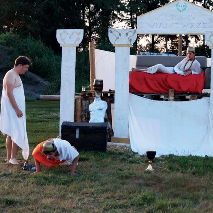 Bij KSA Puurs Jongens voelde het kamp meteen aan als een sprongetje terug in de tijd: gladiatoren overal! Ik werd persoonlijk verwelkomd door keizer Maximus en kwam meteen in een groots toneelstuk terecht. De jongens waren druk bezig met de voorbereidingen voor de begrafenis van zijn broer. Een doodskist timmeren? Geen probleem. Een kruis voor aan het graf? Check. Elixers brouwen voor de grote reis naar het hiernamaals? Uiteraard! En alsof dat nog niet genoeg was, maakten ze ook een boeket dat elk Romeins bloemschikteam jaloers zou maken.