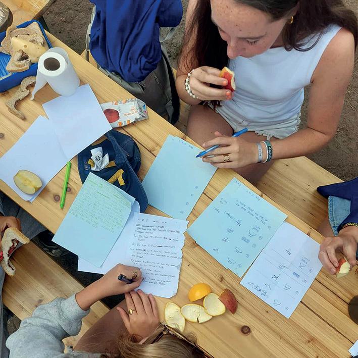 Onze tocht eindigde in het Pajottenland. Het kamp bij KSA Plus Moorslede liep op zijn einde, maar dat was nergens te merken aan de energie van leden en leiding. Dansjes oefenen, een geheim cadeautje in elkaar knutselen … De leden waren druk in de weer, terwijl de leiding graag even de tijd nam om bij te praten. De vibes? Helemaal chill!
