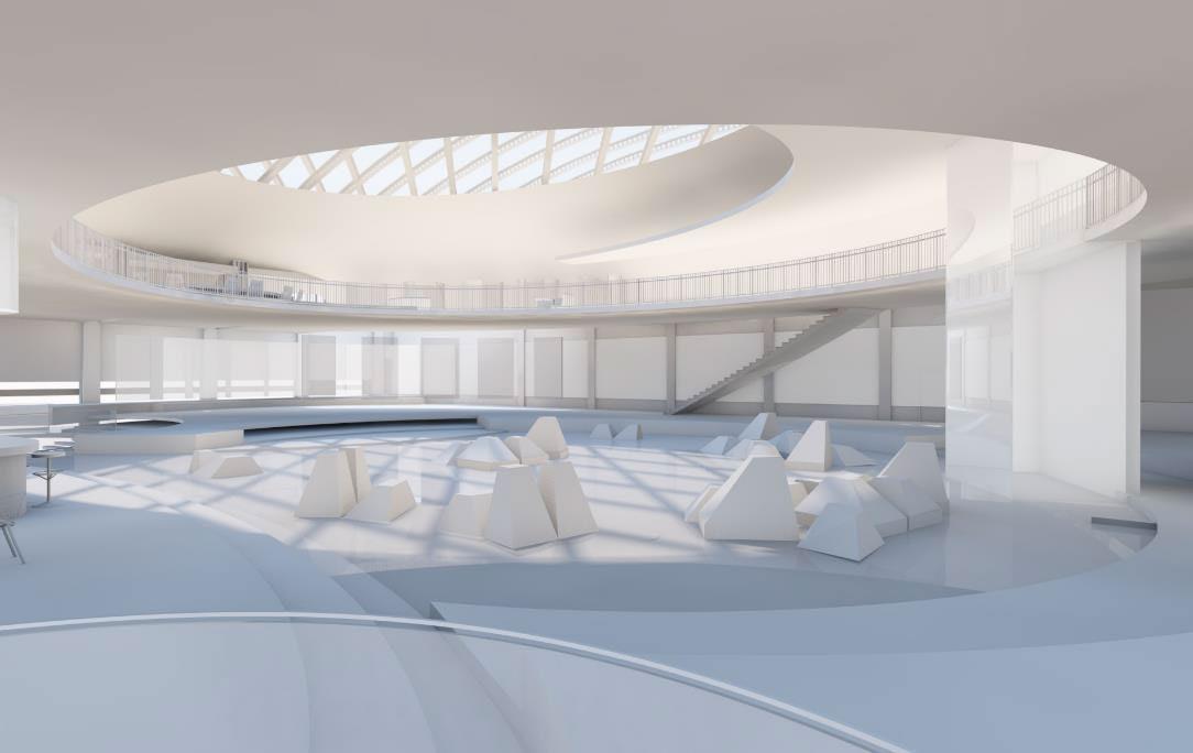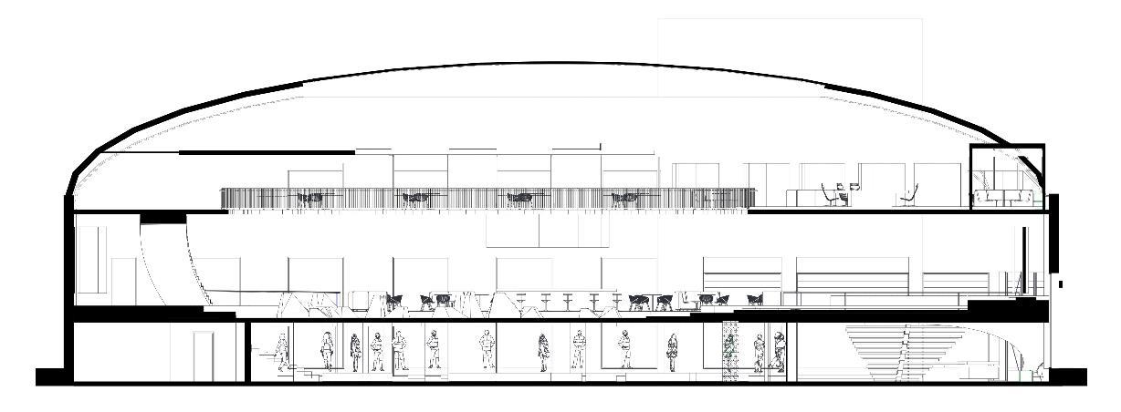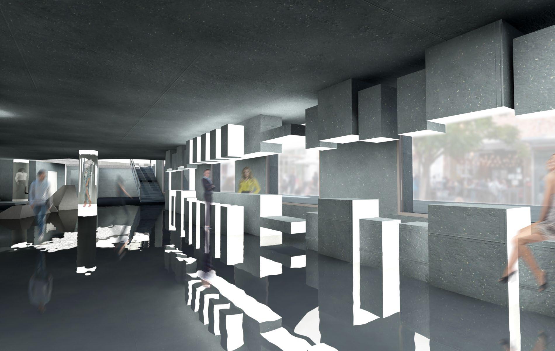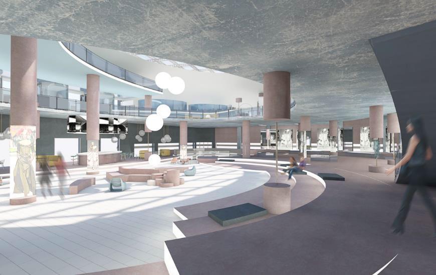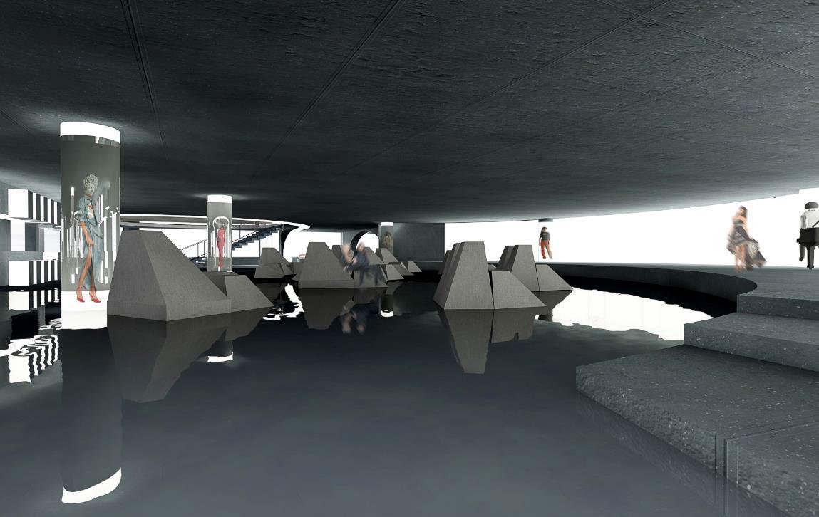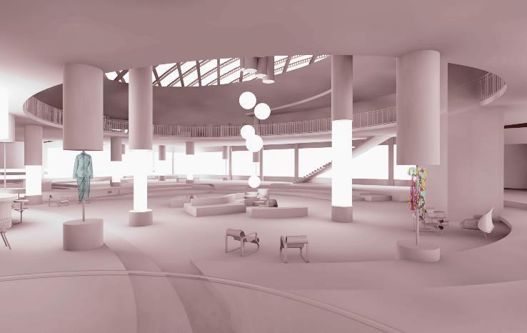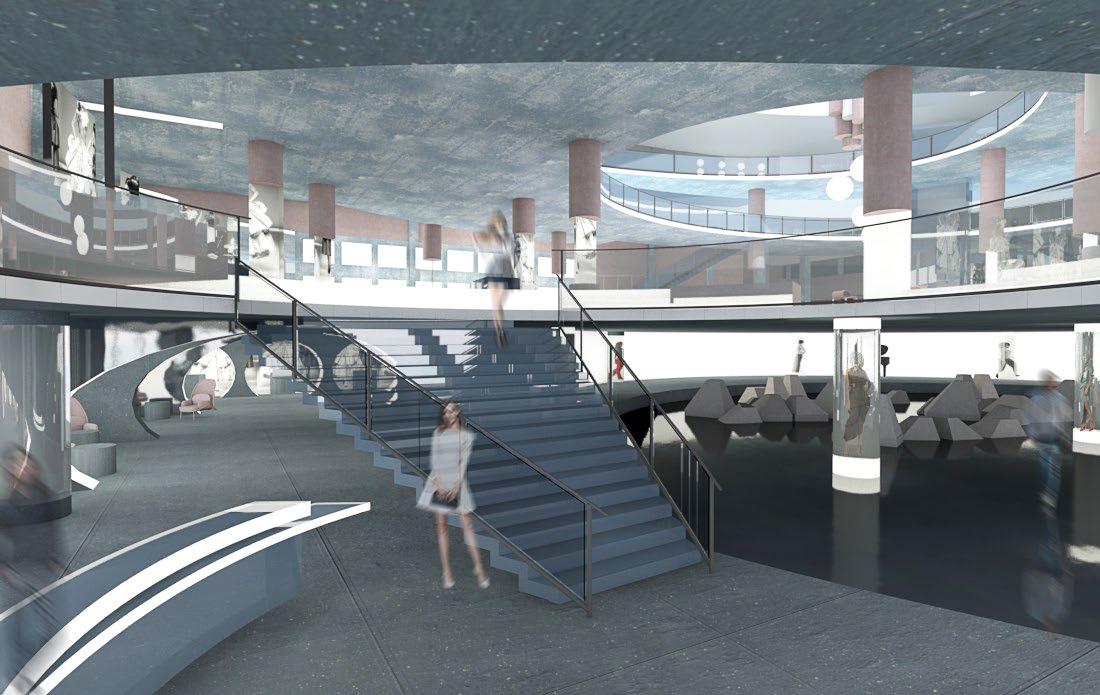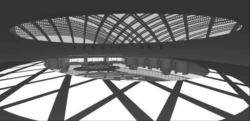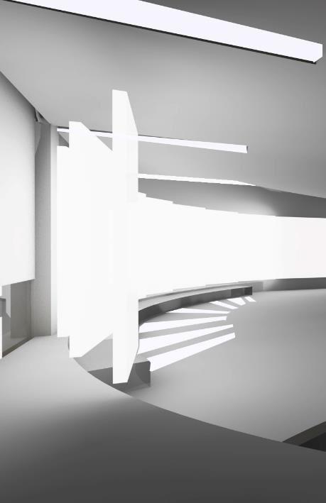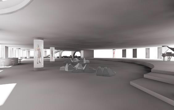 Digital screens, mirrors and capsules Give mysterious artificial lighting. First level is the darkest intentionally to make focus on the exhibition screen. Going up the space becomes lighter due to the glass dome roof and open floors.