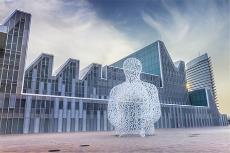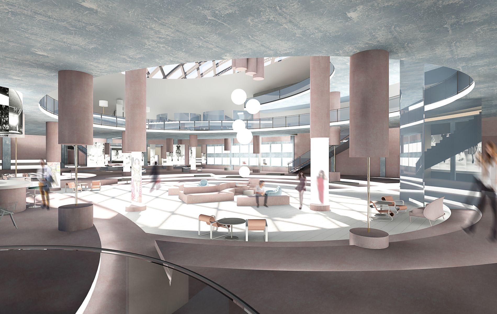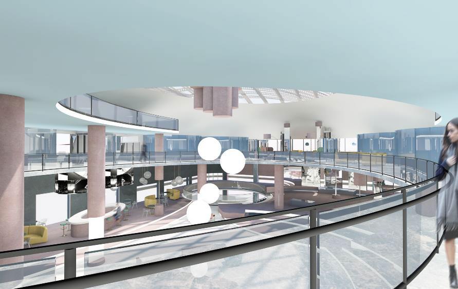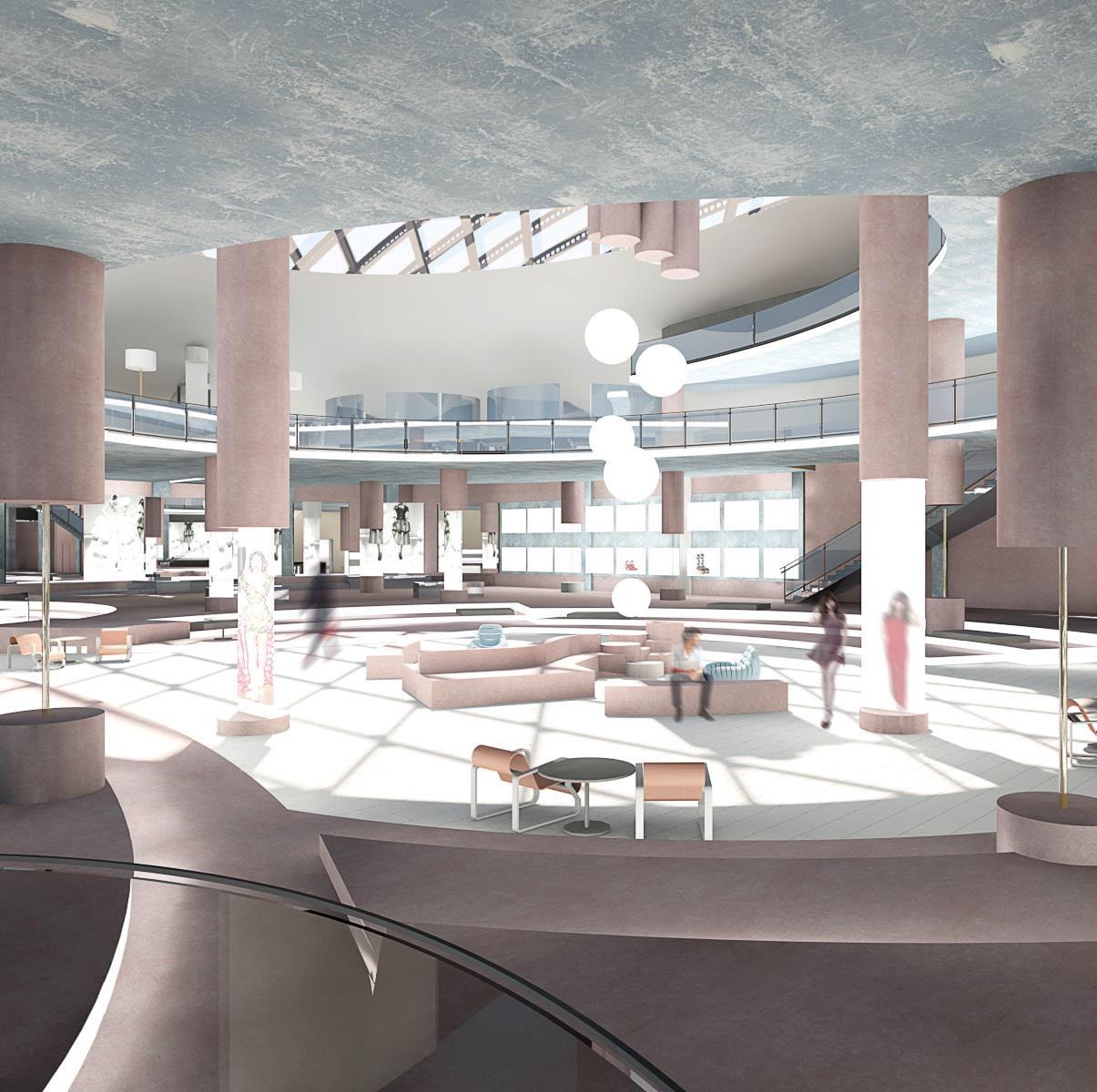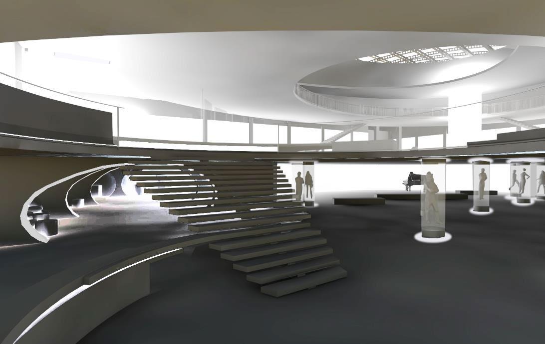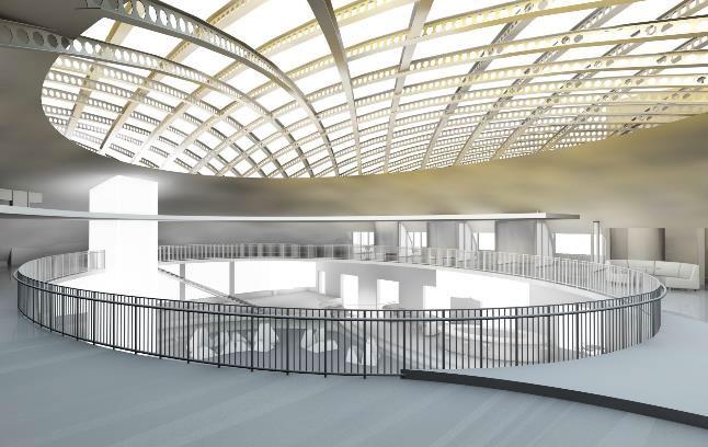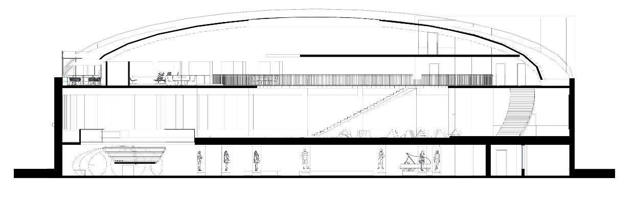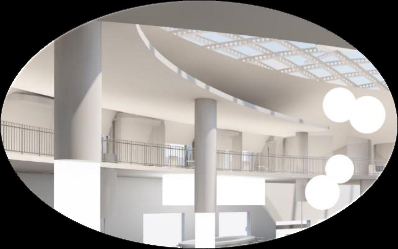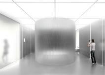 Digital screens, mirrors and capsules Give mysterious artificial lighting. First level is the darkest intentionally to make focus on the exhibition screen. Going up the space becomes lighter due to the glass dome roof and open floors.