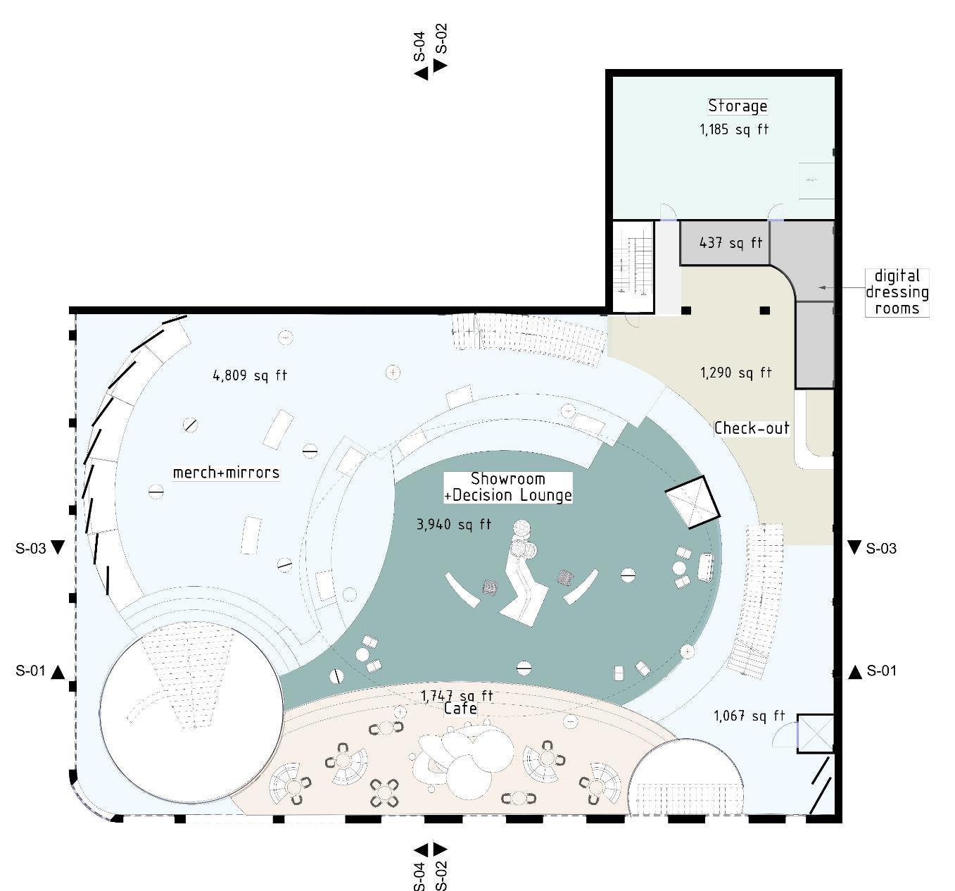 Exhibition area is presented by digital mirrors and real merchandize. Guests can fit and choose outlooks digitally on screens Decision lounge combined with the exhibition area. Guests can get stylist assistance and create their best outlook here.