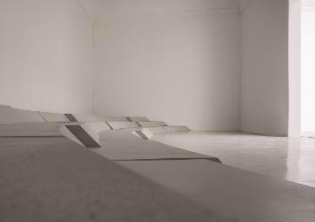 Reflective materials - acrylic glossy floor, glass, metal, mirror are balanced with concrete, stucco, natural fabrics. Contrast between fragile and solid materials.