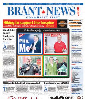 Brant News contains a fresh look with stories that have flare. The writing really engages the reader and encourages them to read more. They do a wonderful job organizing the content and clearly labeling stories and sections. Using more creative and colourful photographs will push this newspaper above and beyond.