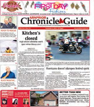 The Arnprior Chronicle-Guide has a sharp-looking front page, good photography and good editorial pages. All three are essential to a successful community newspaper. It also has lots of local news, sports and features. It gives the reader a strong sense of what is happening in the community. Ads are well-designed and nicely positioned throughout the paper, and it has an overall clean and fresh look.