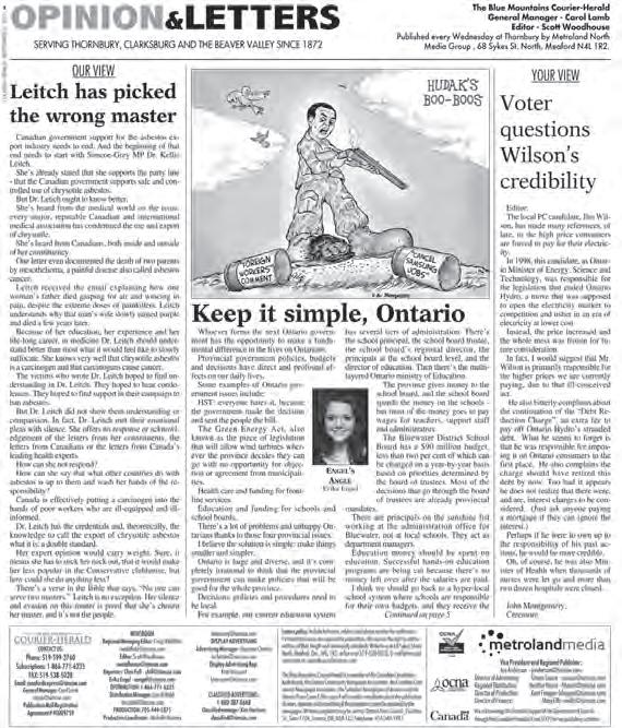 Kawartha Lakes This Week – This newspaper earned its honourable mention on the strength of its local news coverage. The two news stories on the front pages submitted stood out as some of the best news reporting in all of the entries in this category. Others could learn from the kind of hard news reporting published in Kawartha Lakes This Week.