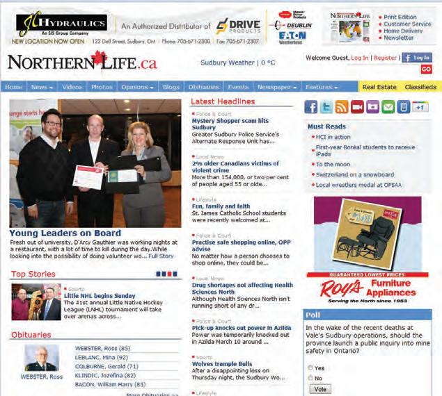 NorthernLife.ca is the perfect hybrid of a modern and traditional newspaper. Like any good community paper there are lots of local ads and local faces with an online photo gallery that spans over 5 years. The design is simple and clearcut with a noteworthy rethinking of their navigation bar. Featuring obituaries with pictures on the home page is unusual and it would be interesting to see how that has impacted page views. Editorially, content is very local and frequently updated on all of the various navigation bars, their use of video to tell the story is notable in terms of quality and content. Along with the usual Facebook, Twitter, Google self-marketing it was good to see a newsletter option and as well a very active local calendar.