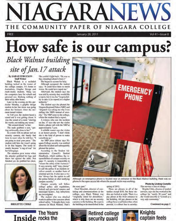 Sarah Ferguson’s article “How safe is our campus?” offers great lede that transitions seamlessly into an artful, accurate and sensitive retelling of an incident that befell a young female student in one of Niagara College’s buildings. Ferguson gets to the bottom of why safety equipment that is available in other buildings was missing from the one where the incident took place. The sidebar on personal safety tips was a nice touch.