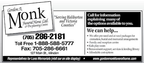 Memorial Donations to the Haliburton Highlands Health Services Foundation (HHHSF) would be appreciated by the family. www.gordonmonkfuneralhome.com