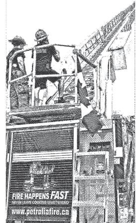 $2,800 plus $383 duty and gave excellent service for 50 years, FIRST FIRE HALL Petrolia’s first fire hall was erected by the council on a lot donated by the Great Western Railway facing Main Street. The fire engine and lock-up were located on the ground floor with the clerk’s office, council chambers and court room upstairs. At the rear was a 60-foot tower or square derrick used for hanging the hose to dry - also to hold the town bell which was the fire alarm as well. The hand-drawn hose carts were also stored in the lower part. Before this bell was placed in the tower, the fire alarm – a triangle was used – it was placed high up on the front of the fire or village hall and with the steam whistles, which nearly every oil property possessed, the alarm was loud and long. The men going to and from work all hours of the day and night had a wonderful opportunity of discerning outbreaks of fires. Improvements in the fire department continued. Some 240 feet of “leather hose” was purchased. This consisted of leather rolled in the shape of the present-day hose, but with the joints and seams riveted with copper rivets. It was also manufactured in England, while solid rubber hose came a few years later.