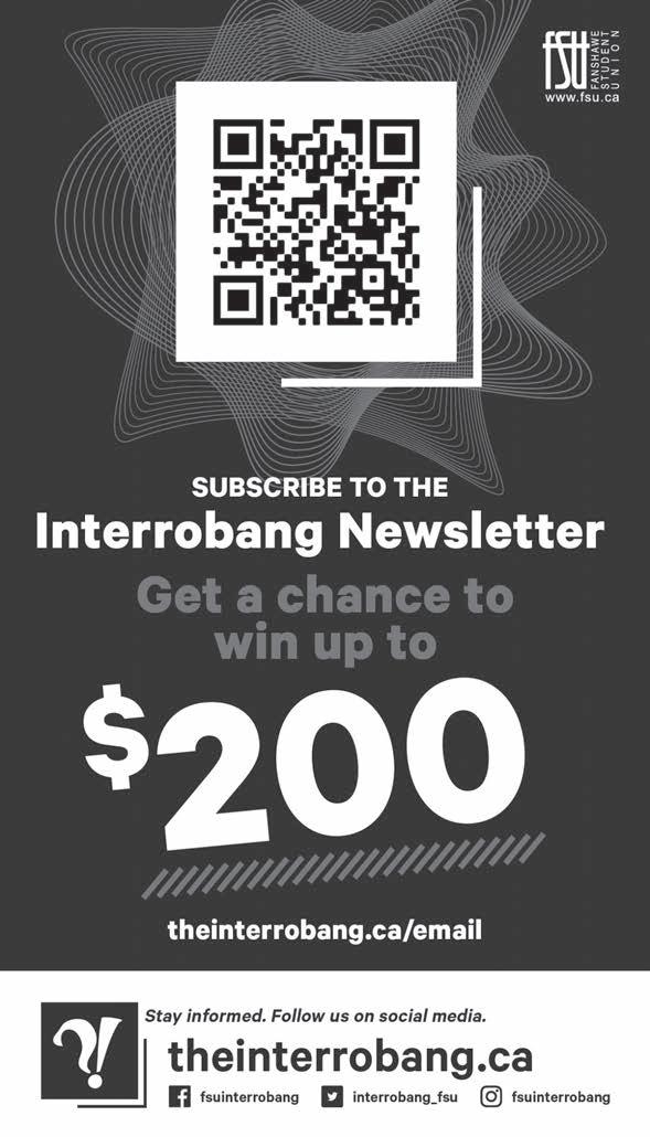 Legal: Editorial opinions or comments expressed in this newspaper reflect the views of the writer and are not those of the Interrobang or the Fanshawe Student Union. All photographs are copyright 2021 by Fanshawe Student Union. All rights reserved. The Interrobang is printed by McLaren Press Graphics, 1021 Langford Drive, Gravenhurst ON P1P 1R1 and published weekly by the Fanshawe Student Union at 1001 Fanshawe College Blvd., Room SC2001, London, Ontario, N5Y 5R6 and distributed through the Fanshawe College community. Letters to the editor are welcome. All letters are subject to editing and should be emailed. All letters must be accompanied by contact information. Letters can also be submitted online at theinterrobang.ca by following the Interrobang links.