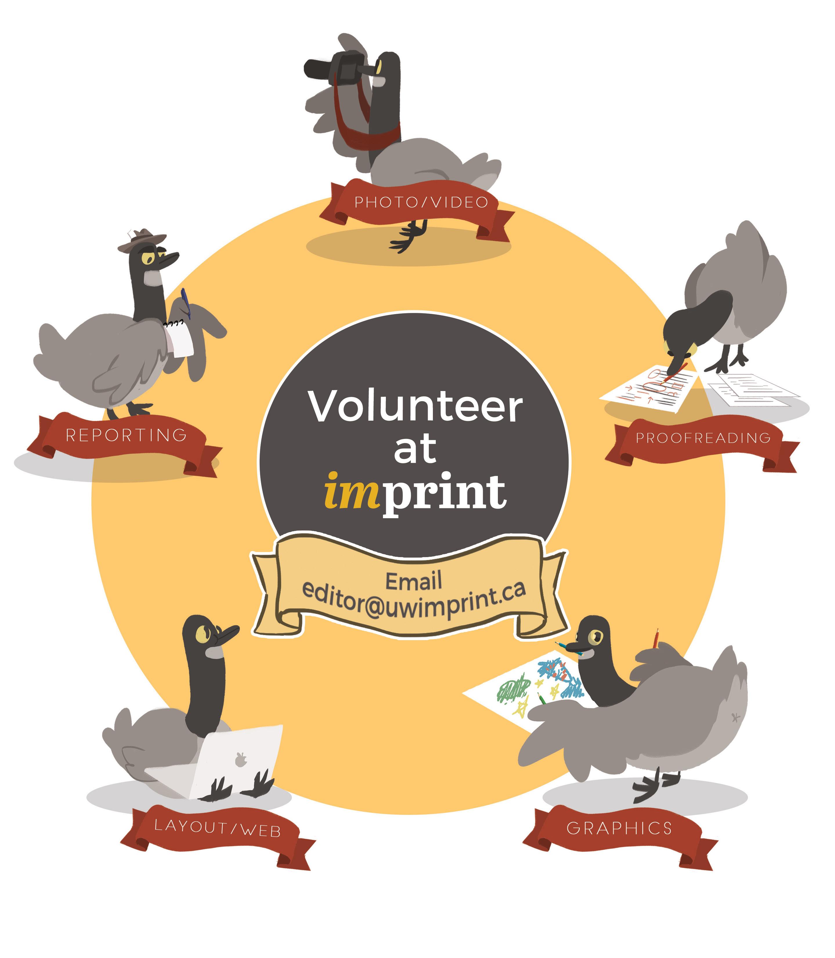 Imprint is the official student newspaper of the University of Waterloo. It is an editorially independent newspaper published by the Federation of Students, University of Waterloo, carrying on business as the Waterloo Undergraduate Student Association (“WUSA”), a corporation without share capital. Imprint is a member of the Ontario Community Newspaper Association (OCNA). Content is provided for general information, education and entertainment purposes only, and does not necessarily reflect the views of the Editorial Committee, WUSA, staff or advertisers. We welcome editorial submissions, articles, letters, photos and graphics (“Submissions”) for publication in any edition of Imprint, subject to terms and conditions for Submissions, which are available upon request. Imprint does not guarantee that Submissions will be published. Imprint reserves the right to approve and edit any Submissions to be published. A Submission will not be published if it is determined to be libelous or in contravention of Imprint’s policies, code of ethics and journalistic standards. Imprint may reproduce content, including Submissions, commercially in any format or medium. Imprint disclaims direct and indirect liability for reliance on or use of its content. Imprint is published every Wednesday during fall and winter terms, and every second Wednesday during the spring term. Imprint reserves the right to screen, edit and refuse advertising. One copy per customer. Imprint ISSN 0706-7380. Imprint CDN Pub Mail Product Sales Agreement no. 40065122.