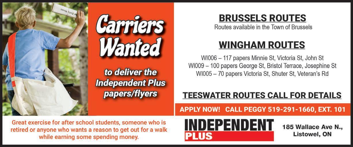Thursday, June 16, 2022 - Independent Plus - Page 13 help wanted for sale farm equipment/machinery help wanted help wanted help wanted help wanted apartment for rent farm for sale CLASSIFIEDS To place your ad call 519.291.1660, ext. 101 to place an ad or email phaasnoot@midwesternnewspapers.com Fax: 226-430-3022 To place your ad call 519.291.1660, ext. 101 to place an ad or email phaasnoot@midwesternnewspapers.com Fax: 226-430-3022 Wellington Advertiser is looking for Carriers & Rural Route Drivers