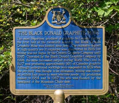 A rich graphite seam found near White Fish Lake launched the Black Donald Mines in 1895. Black Donald was a remote and bustling community with a one-room schoolhouse, general store and church, and at one point, it accounted for 90 per cent of all the graphite mined in Canada. After almost 55 years in production, the mine closed after fires and a massive flood. Stop and admire the plaque that shares the history of this town along Graphite Bay Road, and through the trees, view the hydro infrastructure that has been in place since 1967. Hydro purchased the land along the Madawaska River and flooded 8500 acres to develop the massive Mountain Chute Dam, creating Black Donald and Centennial Lake and forever burying the remains of the townsite of Black Donald Mines.