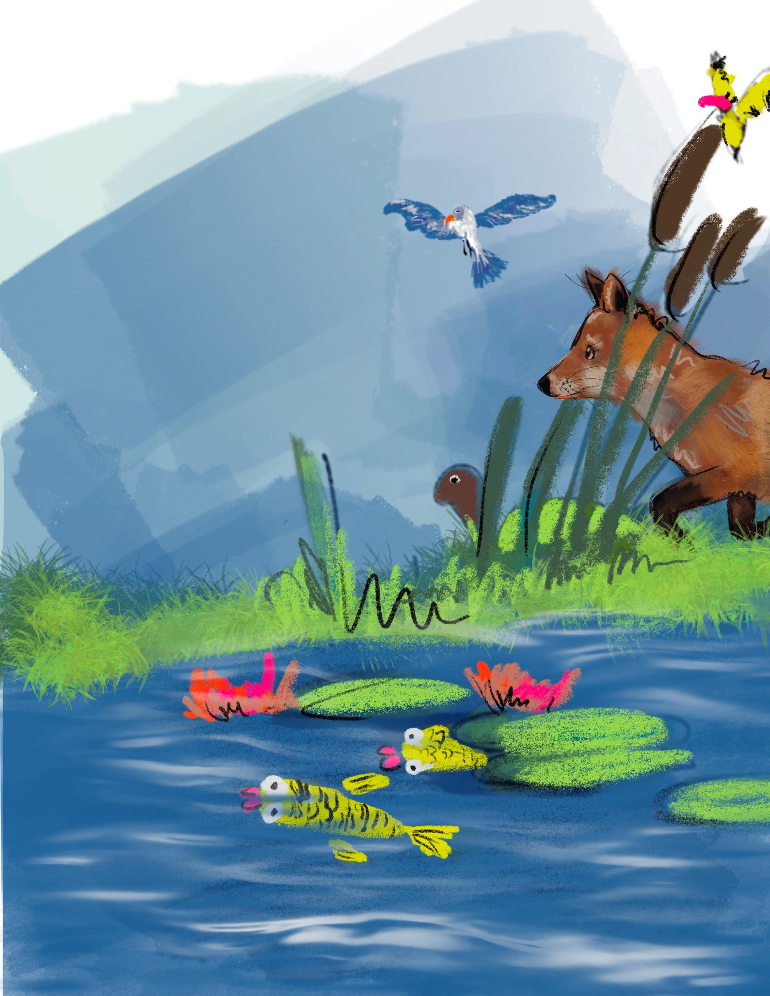 Rain falls from the sky, drip-drop, Frogs in rivers and streams jump and hop. A tributary joins the flow, Into bigger rivers they go.