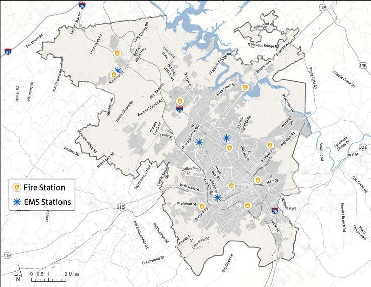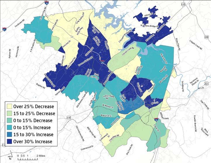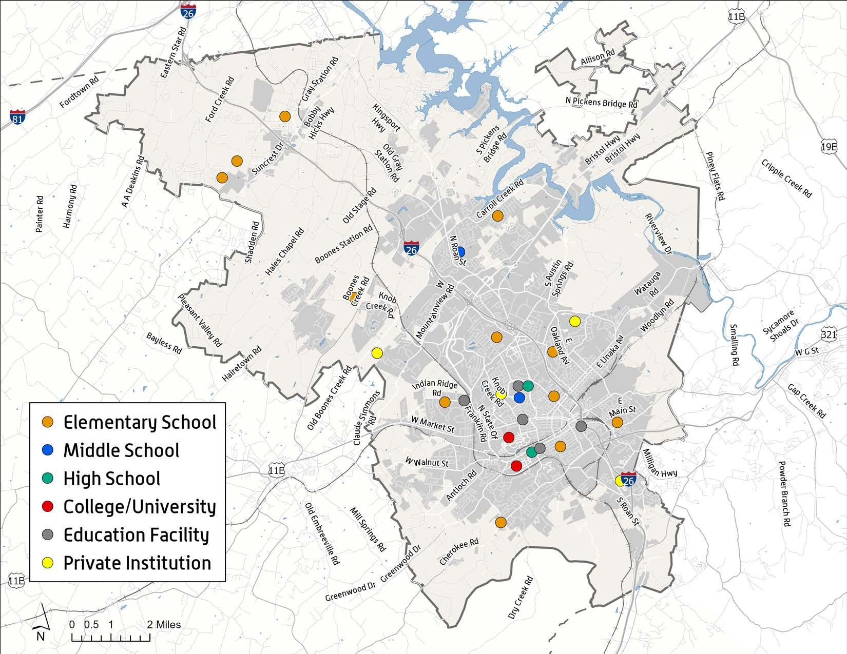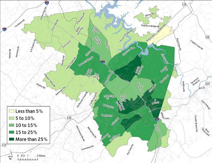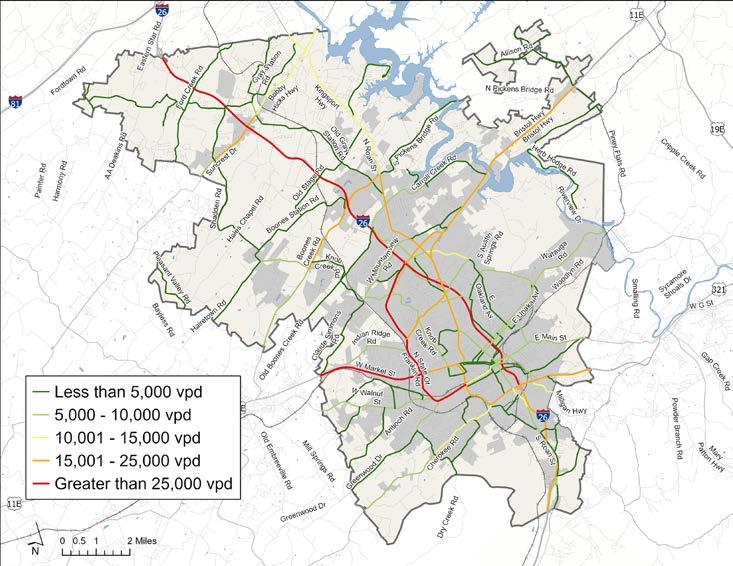 • 3 roadways within the study carry more than 30,000 vehicles per day (vpd), including I-26, State of Franklin, and West Market Street