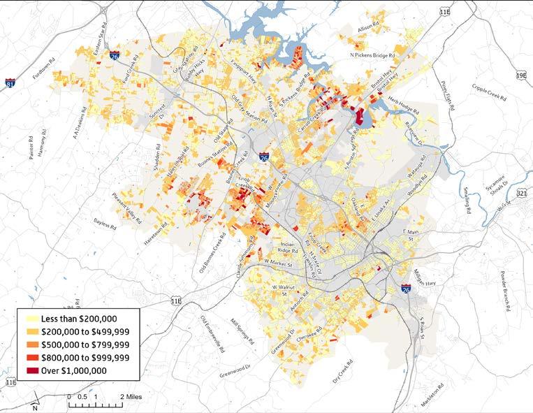 The map below showcases property values of acreage in the Study Area zoned for singlefamily housing. Housing in the Study Area tends to be less expensive farther from Johnson City’s downtown and in areas outside the city limits. Housing located near the lake is also priced higher than housing located away from the lakefront.