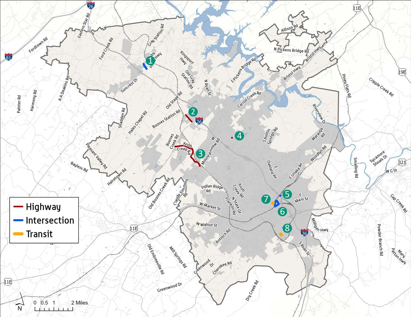 The Johnson City Metropolitan Transportation Planning Organization (JCMTPO) 2023–2026 identifies state-funded projects throughout the JCMTPO’s planning area. The JCGMP Study Area has several funded projects, including roadway improvements, widening projects, intersection redesigns, new traffic signals, and crosswalk improvements. The map to the right shows where these projects are located, and the table below provides more detail about each project.