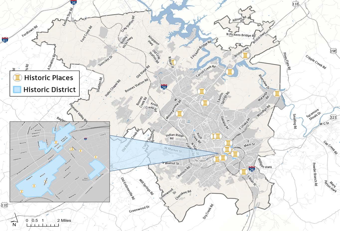 The Study Area includes 23 historic places and four historic districts. The areas are scattered throughout; however, they are concentrated in and around Downtown Johnson City. Sites include homes, farms, and churches.